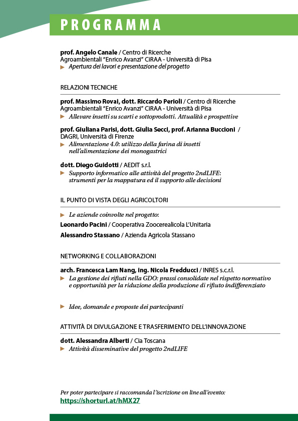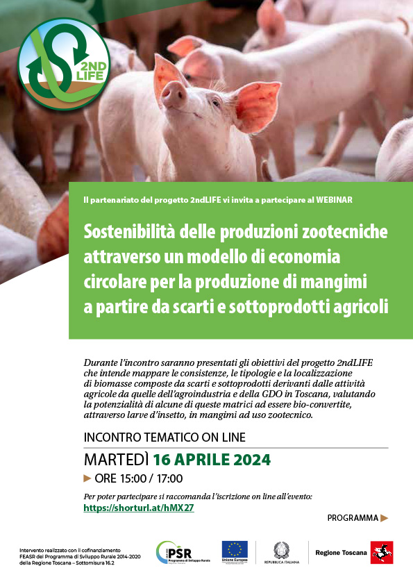 Durante l’incontro saranno presentati gli obiettivi del progetto 2ndLIFE che intende mappare le consistenze, le tipologie e la localizzazione di biomasse composte da scarti e sottoprodotti derivanti dalle attività agricole da quelle dell’agroindustria e della GDO in Toscana, valutando la potenzialità di alcune di queste matrici ad essere bio-convertite, attraverso larve d’insetto, in mangimi ad uso zootecnico.